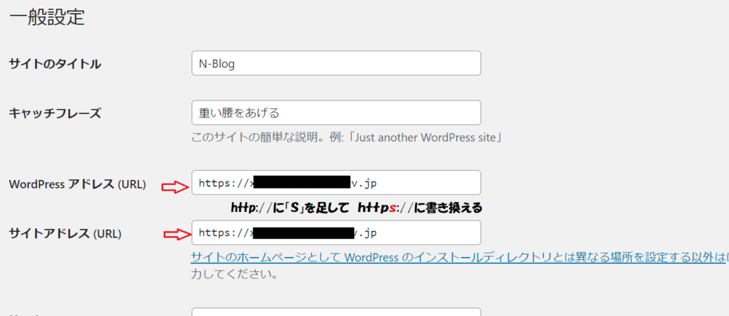 WordPress画面を開き「ダッシュボード」→「設定」→「一般」の画面を開いて下記の画像部分の二か所を書き換える「変更保存」にすると ブラウザ上記に表示されるURLの部分に「」のマークがついたら設定OK!